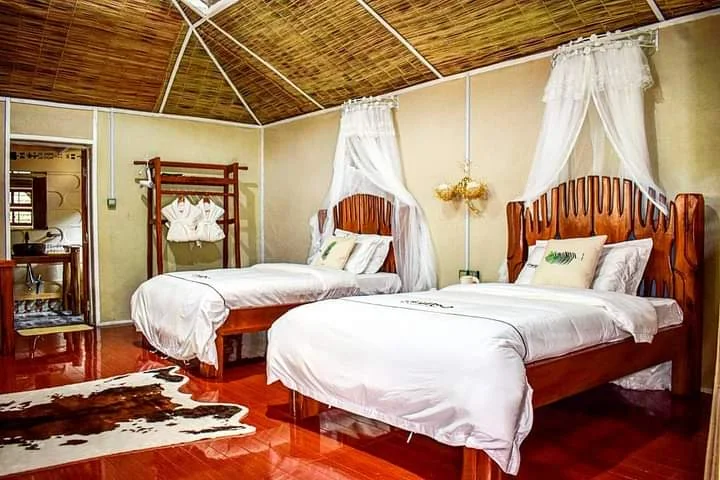 41 chalet-style rooms can be converted into double or twin bedded accommodation and a family room option for those with a child under 12 years old, the total compliant ad Mara Chui noted as 96 guests. Reeded roofs and plastered walls of beige come equipped with an en-suite bathroom offering a hot shower, flush toilet, electric sockets for charging, as well as a reading table & light, comfortable seating and mosquito nets over the bed.